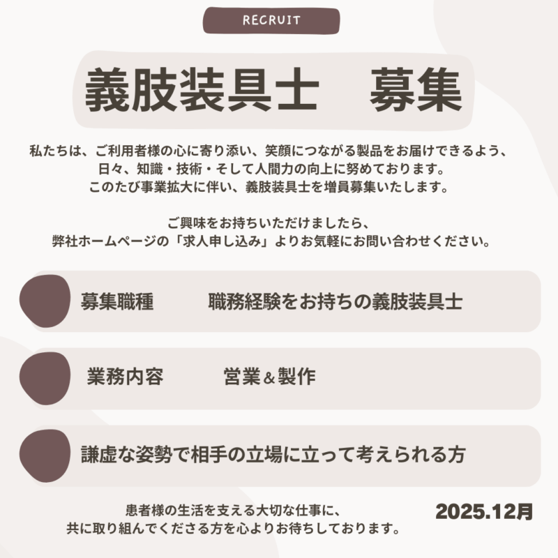 義肢装具士を募集します 2025.12.18 弊社ホームページやインスタグラムをご覧いただき、少しでもご関心をお持ちいただけましたら、 「求人申し込み」よりお気軽にお問い合わせください。 関連リンク 求人情報