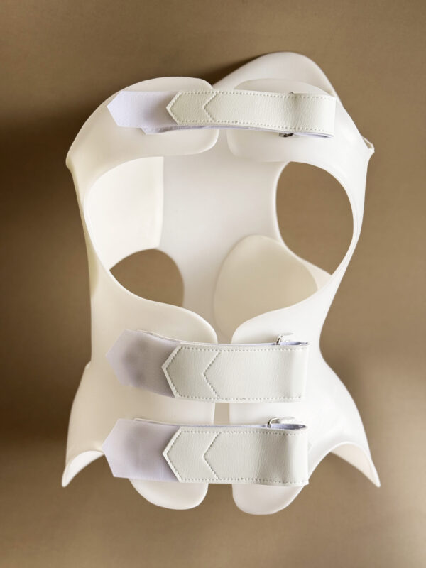 プラスチックのみで矯正するタイプの側弯症装具です。CADを用いてレントゲン写真と合わせて設計・修正します。矯正力があり、装着のしやすい装具です。